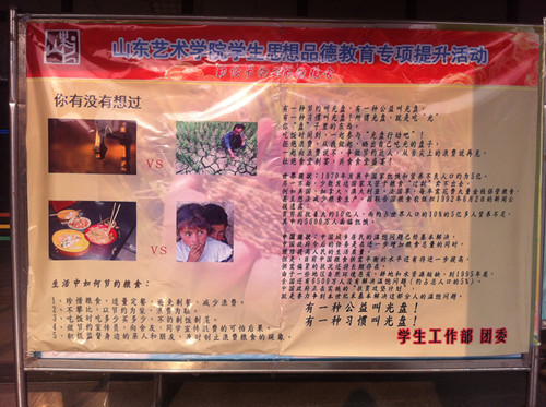 学工部、团委通过在餐厅门口以及学校各显著位置设置展板等方式对当前社会的环境状况进行了广泛的宣传和详尽的展示,主要在“节约粮食”、“节约用电”、“节约用水”、“节约用纸”四个方面将低碳生活的理念深入推广,希望能够通过此举让同学们对当前的环境问题有更加清醒的认识,反省自身的日常行为是否有不符合“低碳生活”要求的行为,并且以此为切入点,带动全校学生从生活的小事做起,从自身做起,着力培养自己的勤俭节约习惯、低碳环保意识、思想品德水准。