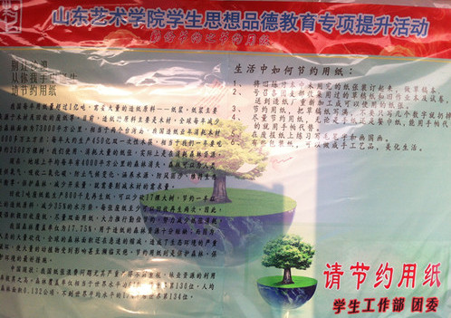 本站讯 为深化党的群众路线教育实践活动成果,深入推进山东艺术学院学生思想品德教育专项提升工程,进一步加强我校学生思想品德教育工作,近日,学工部、团委举办了“践行节能低碳 建设美丽校园”图片展。