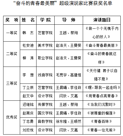经过激烈角逐,艺术管理学院韩杰同学摘得一等奖桂冠(获奖名单如下图)。