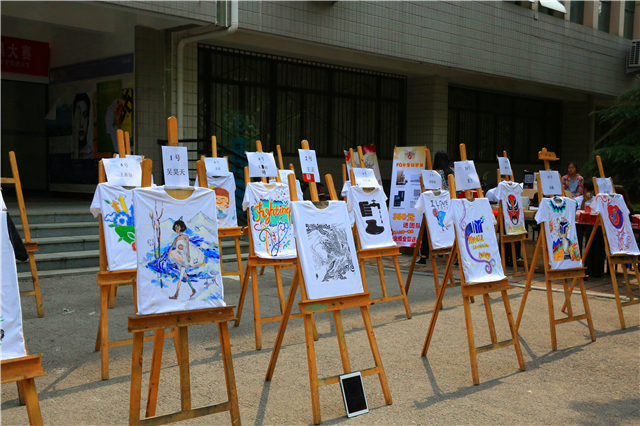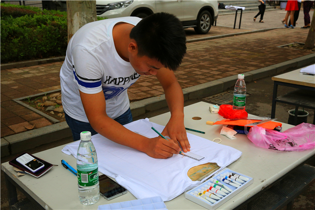 校园文化衫涂鸦大赛在DS街舞社团活力四射的街舞表演中拉开帷幕,来自各二级学院的十八名参赛选手需要在一个小时的时间里创作出精彩的涂鸦作品。他们迅速进入到比赛状态,胸有成竹,认真勾勒,用心描绘,热情涂鸦,一件件白色的文化衫在选手们的画笔下变成一件件有着独特风格和深刻内涵的艺术作品,充分展现了艺苑学子丰富的想象能力和动手能力。