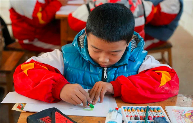 当温柔婉转的音乐声响起时,教室门前的小朋友有序地排列成体操队形,跟着前面的“老师”,做着热身准备活动。偶尔有几个不“安分”的小朋友,时不时和旁边的小朋友对视一眼,哈哈一笑,这时,“老师”就会走近他们,对他们做出“严厉”的表情,然后说道:“待会重点检查你们哦!”课堂气氛快乐、温馨。二三年级的美术课上,男孩子是最活跃的,相比之下,女孩子则是显得更加的腼腆、羞涩。在“老师”给大家出了一道以“最快乐的日子”为题的绘画任务之后,孩子们纷纷动笔,用图画传递自己的快乐。男孩子争先恐后将自己画作展示给“老师”们看,热情的小脸上还夹杂着一丝调皮,女孩子们则是等“老师”们走到自己身边时,再轻声向“老师”讲解自己的画作,然后根据老师的要求对自己的作品进行修改。课堂上时而传来“老师”和孩子们互相讨论的笑声,时而传来孩子们对老师在黑板上所画的简笔画的赞叹声,课堂上充满欢声笑语。“有一位老爷爷姓顾,养了一只兔……”楼上五年级教室传来孩子们的朗读绕口令《捉兔》的声音。孩子们尽管在朗读的时候会出现这样或那样的口误,但还是勇敢的继续读下去,当他读完时,全班小朋友对他报以热烈掌声!根据班级人数,“老师”带着小朋友们排练了课本剧《西游记》和《七仙女》,然后拿出了准备好的彩色玻璃糖给小朋友们作为奖励,分发下去,看着孩子们洋溢的笑脸,志愿者们的心里感到一阵阵暖意。
