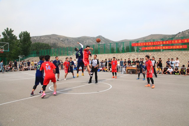 2014年“艺苑杯”学生篮球赛男子组决赛由公共课教学部副主任、国际级篮球裁判王晓春老师执法,对阵双方为戏剧影视学院和设计学院。由于知根知底,比赛一开始双方就陷入了拉锯战,风格相似的两支队伍互有攻防,你来我往,比分交替领先。戏剧影视学院在灵魂人物0号穆凡宇带领下,通过有板有眼的战术配合与设计学院周旋,穆凡宇也凭借良好的意识多次抢断成功,快速推进到前场上篮得手,并投中两记精彩的三分球。在戏剧影视学院有针对性的严防死守下,设计学院的场上核心17号戴宇航每一次接球、突破、投篮都非常困难,1号组织后卫路赟挺身而出,他灵巧机智的突破、精准及时的上篮给戏剧影视学院制造了很大麻烦,比分一直处于胶着状态。全场比赛的最后5秒,设计学院仅以两分领先,33号王蕾造成戏剧影视学院犯规,罚球一罚命中,第二罚弹框而出,在混战中设计学院26号段誉斐幸运地补篮命中。由于所剩时间不多,戏剧影视学院最后一投不中,设计学院最终以55:51的微弱优势险胜戏剧影视学院,赢得男子学生篮球赛冠军。