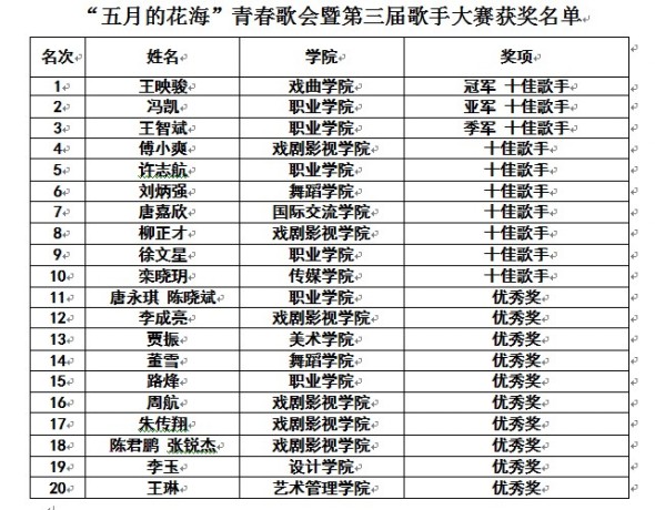 经过层层选拔从预选赛中脱颖而出的二十名选手进行了最后角逐。决赛由一首激情四射的《what’s up》拉开帷幕,在众多演唱曲目中,有让人激情澎湃的摇滚乐、有让人细细品味的情歌、更有情深意浓的民族乐曲。选手们的倾心献唱,赢得了在场评委和观众的阵阵喝彩。职业学院的冯凯演唱的《也许明天》、舞蹈学院的刘炳强送给我们的《海阔天空》、以及在预选赛中就有不错表现的唐嘉欣带来一首《最长的电影》都给了我们或激情荡漾,或清新雅致,或缠绵悱恻的极致享受。所有参赛选手用热情和歌声演绎着动听的旋律,歌唱内心的青春之声。其中戏曲学院10级戏曲表演专业的王映骏同学带来的《王妃》将比赛推向了一个高潮,现场观众跟随节奏挥动手臂和荧光棒,伴着旋律形成了一片光的海洋。最终,戏曲学院王映骏摘得桂冠,与职业学院冯凯等九人获得“十佳歌手”称号,职业学院唐永琪等获得优秀奖。(获奖名单附后)山东艺术学院“五月的花海”青春歌会暨第三届校园歌手大赛伴随着现场互动抽奖,在现场观众的欢呼声中落下帷幕。