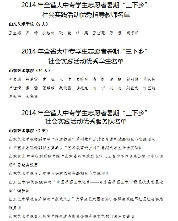 本站讯 日前,省委宣传部、省文明办、省委高校工委、团省委、省教育厅、省学生联合会联合下发《关于表彰“山东移动·和你同行”2014年山东省大中专学生志愿者暑期 “三下乡”社会实践活动先进集体和先进个人的通报》,表彰在2014年暑期“三下乡”社会实践活动中表现突出、做出显著成绩的优秀单位和个人。我校团委获得“2014年全省大中专学生志愿者暑期‘三下乡’社会实践活动优秀组织单位”荣誉称号;王立燕等8名教师获得“2013年全省大中专学生志愿者暑期‘三下乡’社会实践活动优秀指导者”荣誉称号;李之渊等20名学生获“2014年全省大中专学生志愿者暑期‘三下乡’社会实践活动优秀学生”荣誉称号;舞蹈学院“走进舞蹈”系列推广活动之走进郓城暑期社会实践团队等7支服务队获得“2014年全省大中专学生志愿者暑期‘三下乡’社会实践活动优秀服务队”荣誉称号。其中优秀学生获奖人数创历年新高。