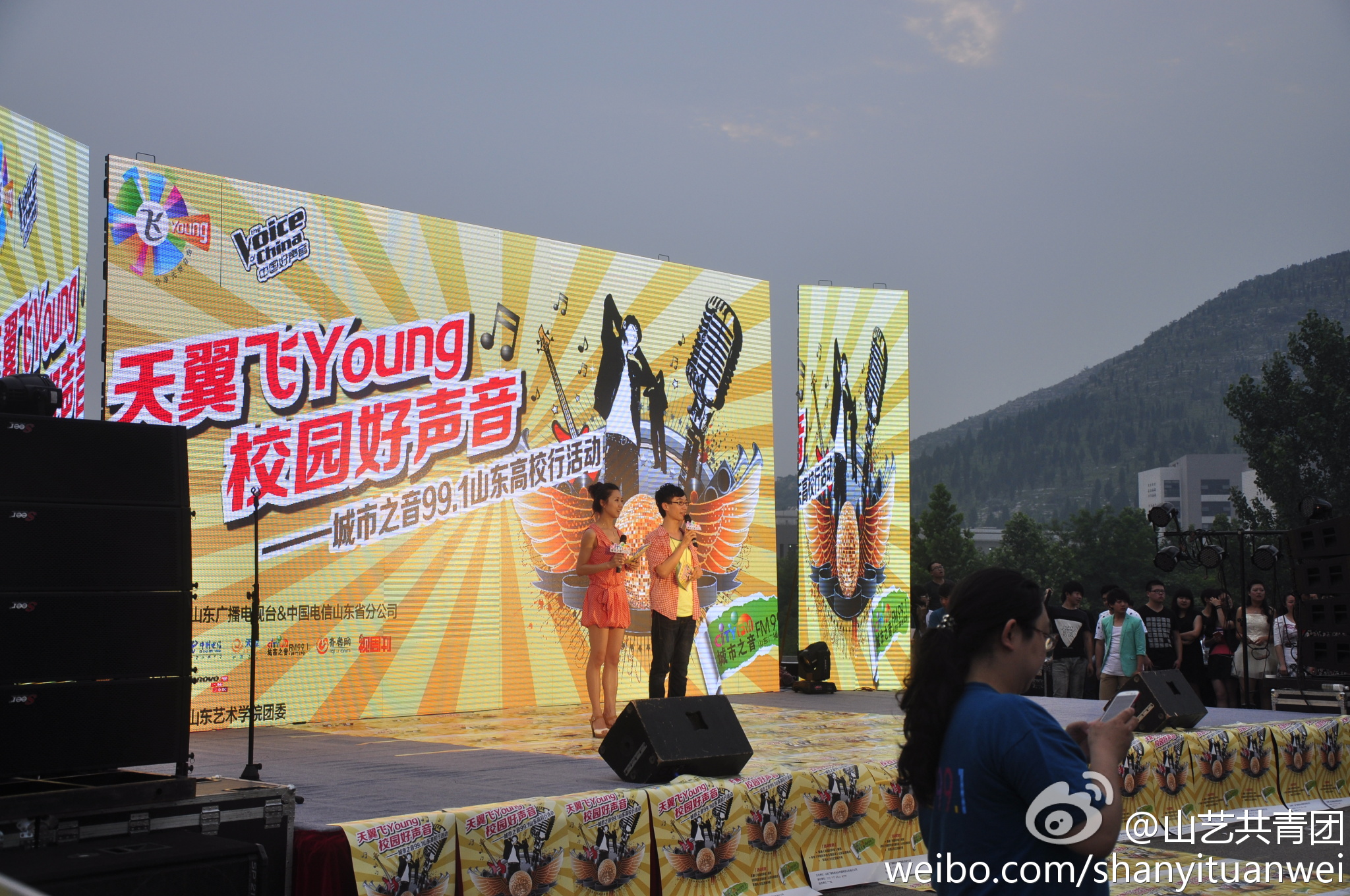 本站讯由山东广播电视台、中国电信山东省分公司联合城市之音FM99.1、联想山东、齐鲁网等共同推出的《天翼飞young校园好声音》总决赛6月19日晚7点在我校长清校区篮球场激情唱响。来自济南、济宁、淄博、泰安等地的21名优中选优的“好声音”同台竞技,校园的舞台炫目灿烂,校园好声音精彩无限。大赛由城市之音FM99.1资深主持人大庄、我校青年教师董莉及山东电信张洁担任评委,我校师生连同来自各地选手的亲友团等1000余人现场观看了比赛。