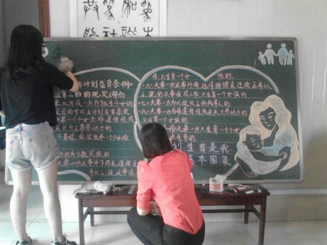 9月26日,校团委组织4名大学生志愿者赴我校社会实践与志愿服务基地——济南市公交营运中心五公司,为五公司制作了以“计划生育”为主题的黑板报。活动中,志愿者们发挥自己的专业特长,精心设计,认真绘制,一丝不苟,用简洁温馨的构图、详实明了的文字,图文并茂地展现了“计划生育是基本国策”的主题,很好的起到了宣传作用。