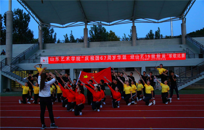 本站讯 为庆祝祖国67周岁华诞,积极贯彻落实学习习近平总书记系列重要讲话精神,丰富2016级新生的军训文化,由校团委主办,校学生会承办的山东艺术学院“庆祝祖国67周岁华诞·喜迎2016级新苗”新生军歌比赛在长清校区运动场成功举办。校团委负责人、学生处相关负责人、军训教官及各二级学院教师代表担任了此次比赛评委,与近两千余名同学共同观看了比赛。