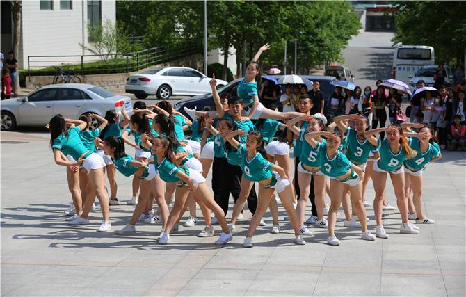 本站讯 5月19日下午14时整,由我校团委主办,舞蹈学院团总支承办,舞蹈学院学生会、自律会协办的第八届校园啦啦操比赛在我校长清校区舞蹈学院办公楼前阶梯广场激情上演。校团委相关老师,二级学院相关负责人和部分师生到现场观看了比赛。校学生会主席及各二级学院学生会主席担任本次啦啦操比赛的评委。