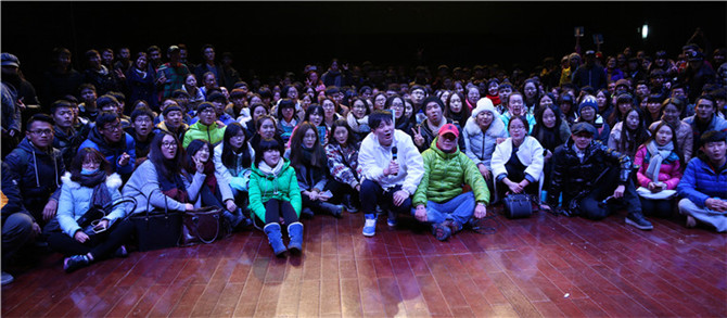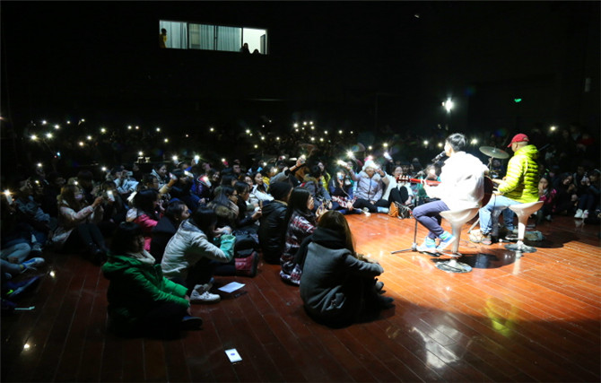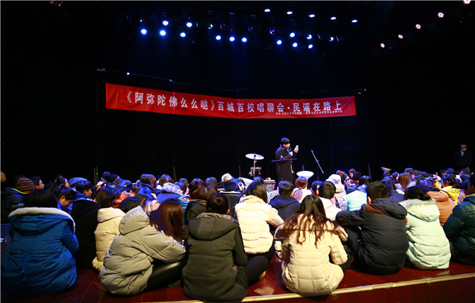 本站讯 11月26日晚,由山东艺术学院团委主办,山东艺术学院学生会学习部承办的“《阿弥陀佛么么哒》百城百校聊唱会·民谣在路上”在山艺传媒学院演播厅盛大上映,座无虚席,气氛十分活跃。
