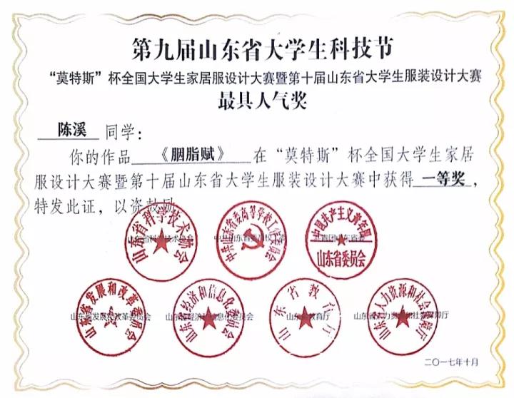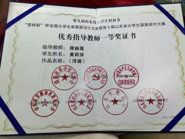 本次大赛由中国纺织工程学会、山东省科协、中共山东省委高校工委、共青团山东省委员会、山东省经济和信息化委员会、山东省教育厅、山东省发展和改革委员会主办,济南市科协、山东工艺美术学院、山东纺织工程学会、济南纺织工程学会承办,山东工艺美院服装学院和现代手工艺术学院承办。我校戏剧影视学院2015级戏剧影视美术设计专业服装设计方向的黄莉萍同学荣获一等奖、最具人气奖三等奖,曾韵涵同学荣获三等奖、最具人气奖二等奖,陈溪同学荣获优秀奖、最具人气奖一等奖,房霖原同学荣获优秀奖、最具人气奖二等奖,王刘锐玥同学荣获优秀奖、最具人气奖三等奖,邵尚彬同学荣获优秀奖,徐丽慧老师荣获优秀指导教师一等奖。