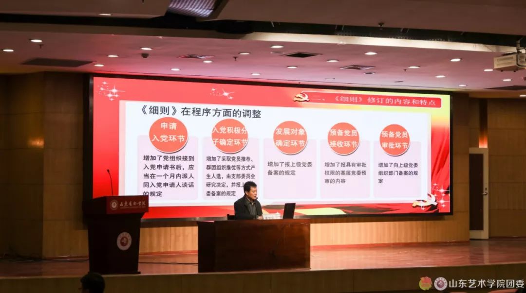 党委宣传部副部长兼新闻中心主任董文化以《发展党员细则浅析》为题,紧紧围绕发展党员工作这一主题,从发展党员工作实务、组织关系接转、党费收缴管理使用三个方面向全体青马班学员解读了新形势下发展党员工作的要求、《细则》修订的内容和特点以及发展党员程序和工作流程。