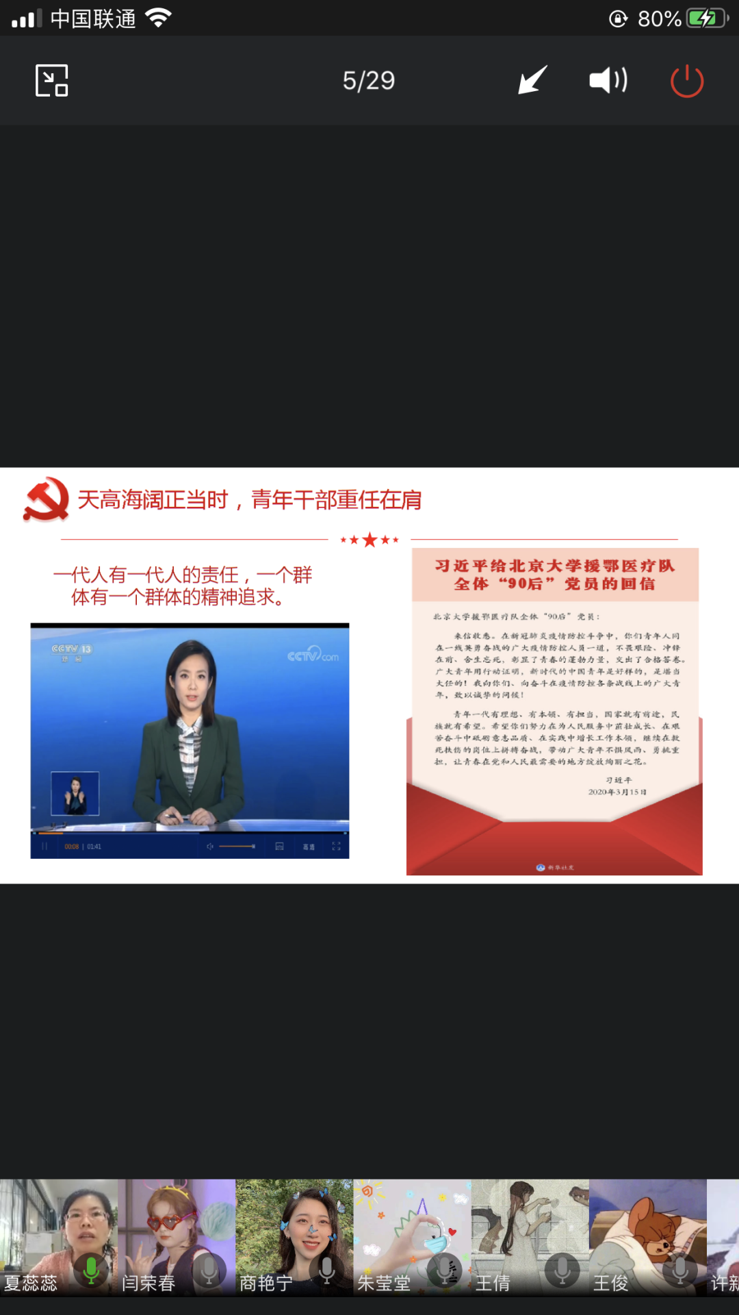 会中,夏蕊蕊老师与青马学员们共同学习了习近平总书记给北京大学援鄂医疗队全体“90后”党员的回信。回信中说道:“青年人同在一线英勇奋战的广大疫情防控人员一道,不畏艰险、冲锋在前、舍生忘死,彰显了青春的磅礴力量。”习近平总书记给予了新一代年轻人温暖而又坚定的回复,鼓励我们要不惧风雨,勇挑重担。