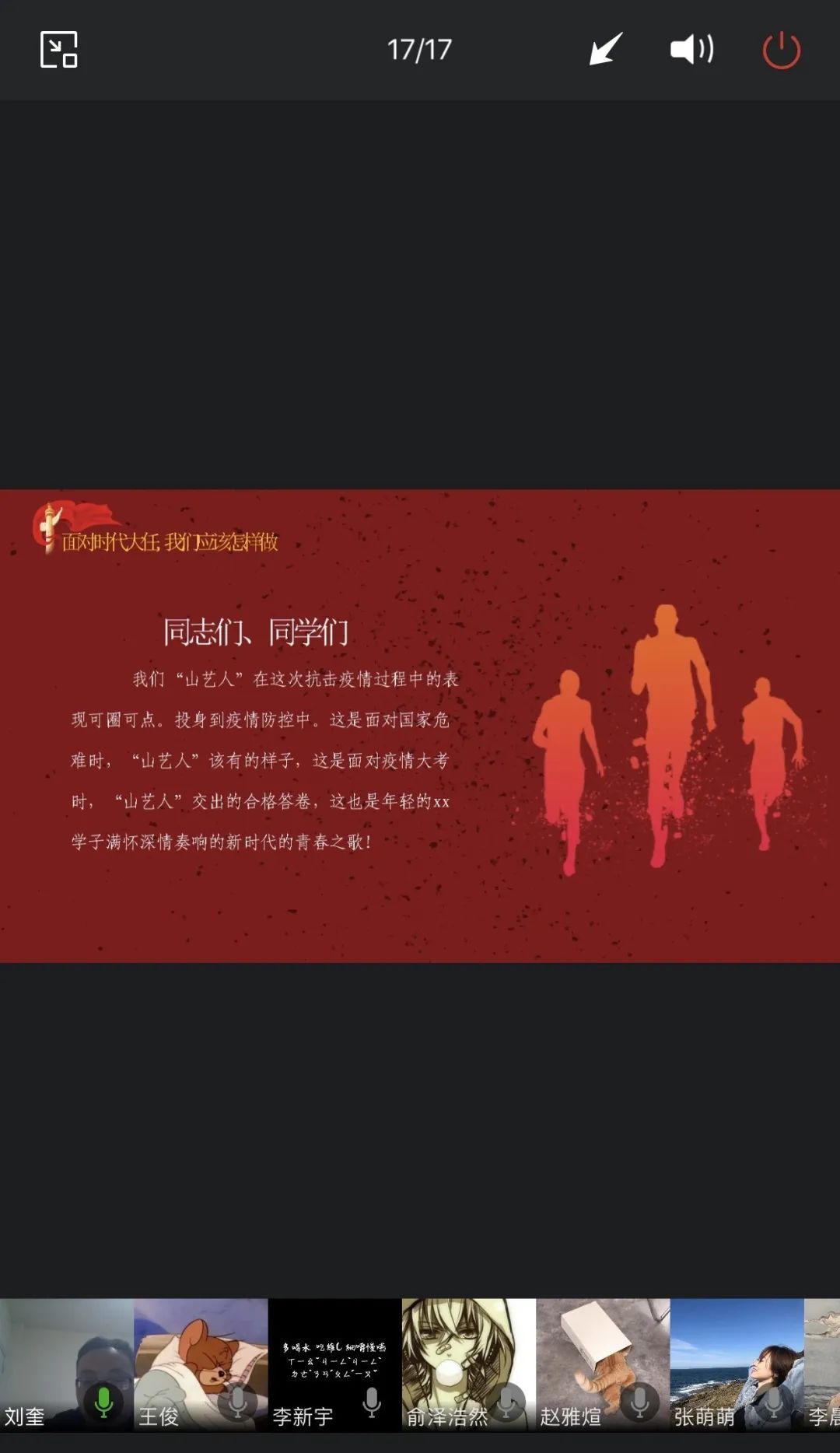 “大时代提供大际遇,小舞台成就大梦想”面对时代大任,刘奎老师建议:首先,树立信仰,用信仰为青春定向,信仰是指引方向的明灯,是关键时刻不畏艰险、冲锋在前的力量。其次,用知识为青春赋能,面对疫情,最有力的武器是科技。再次,努力奋斗,用奋斗为青春添彩,青春是用来奋斗的。刘奎老师提到面对疫情大考时,“山艺人”交出合格答卷,这也是年轻的山艺学子满怀深情奏响的新时代的青春之歌。