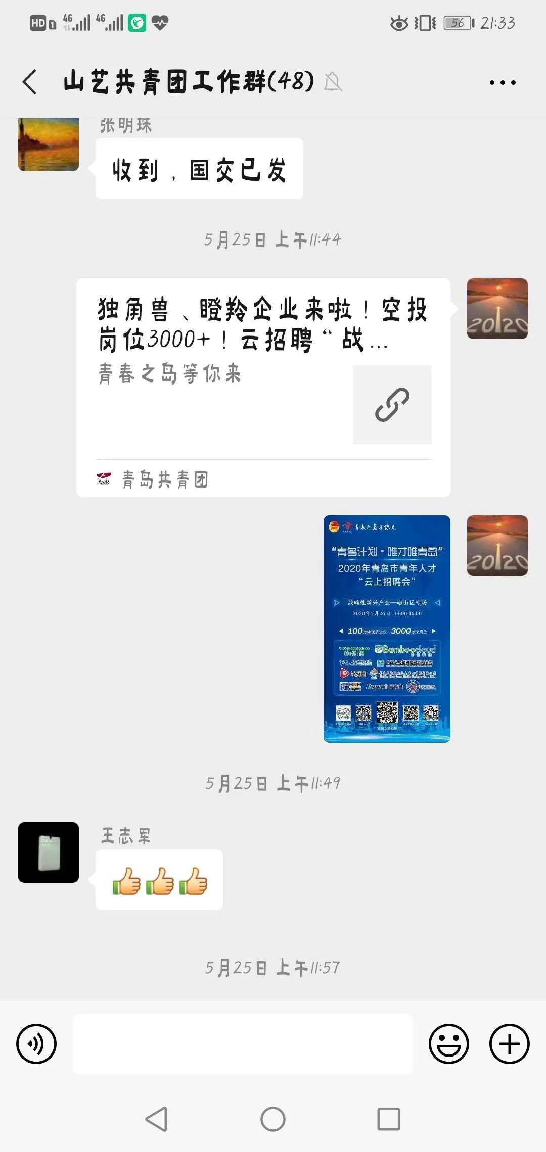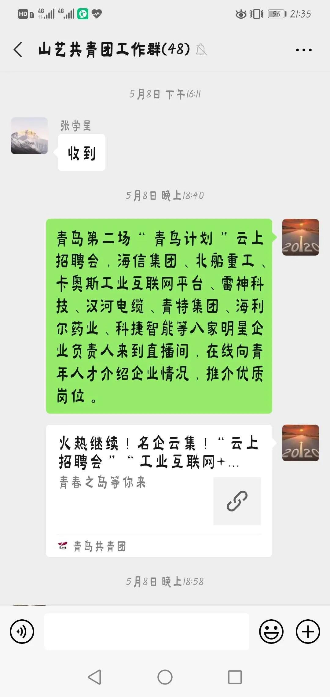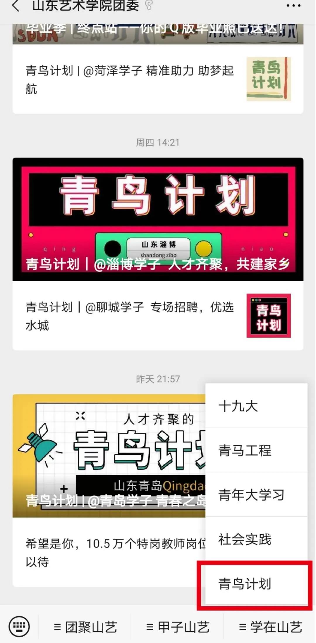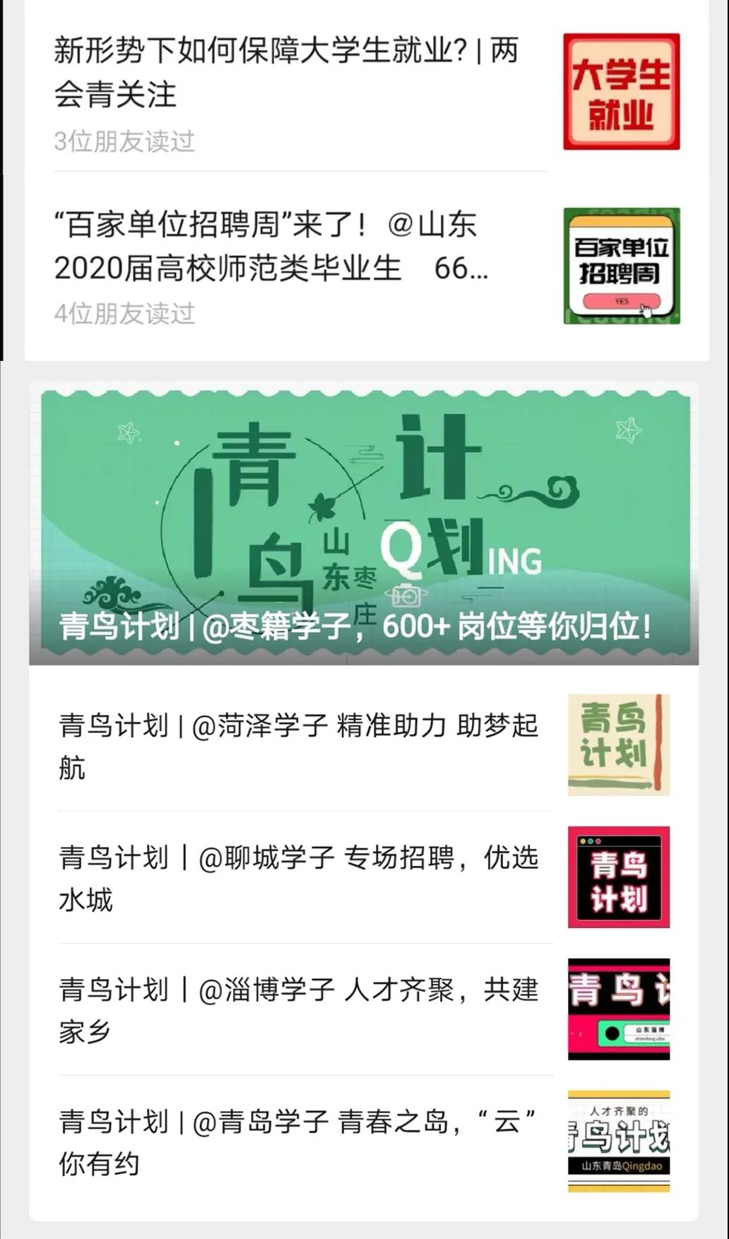 利用好团委公众号平台。团委充分利用团委公众号平台拓展“青鸟计划”就业服务功能,引导青年学生关注两会动态;增设青鸟计划版块,专题转发青鸟计划及相关就业政策、就业信息,先后转发共青团中央青关注《新形势下如何保障大学生就业》、山东教育发布《百万单位招聘周》、各地市青鸟计划招聘等相关信息;指导各二级学院学院团总支将“青鸟计划”融入学校线上就业指导,发挥校友企业优势,吸引校友企事业单位参加线上招聘。
