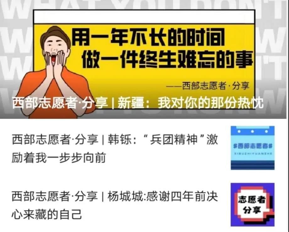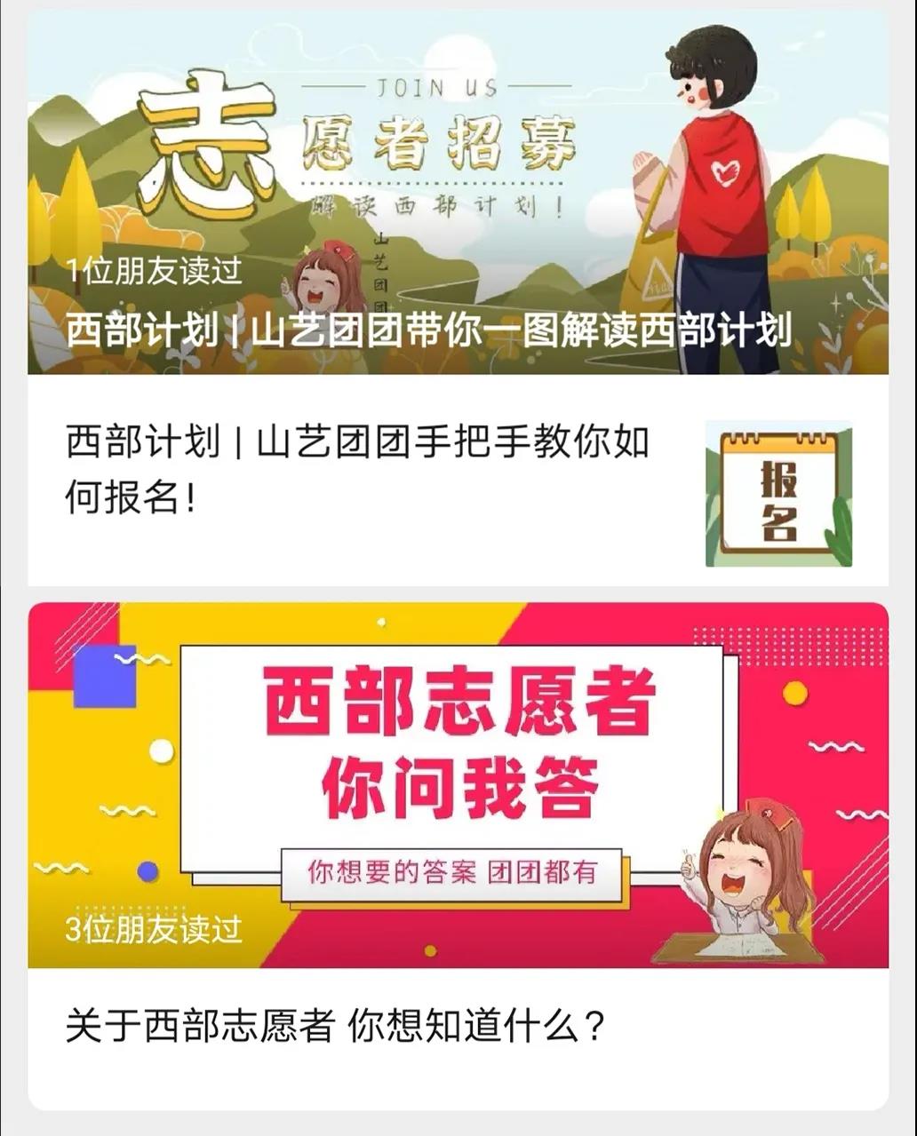 西部计划招聘期间团委公众号转发多期团中央西部计划相关政策性文章,发布《西部计划 | 山艺团团带你一图解读西部计划》、《西部计划 | 山艺团团手把手教你如何报名》、《西部志愿者你想知道什么》等推送,邀请正在新疆、西藏等地进行志愿服务的学生撰写思想感悟、心得体会,进行“云分享”,带动在校学生积极参与到西部计划中,共有29人报名,审核通过15人,相比去年有较大幅度增长。
