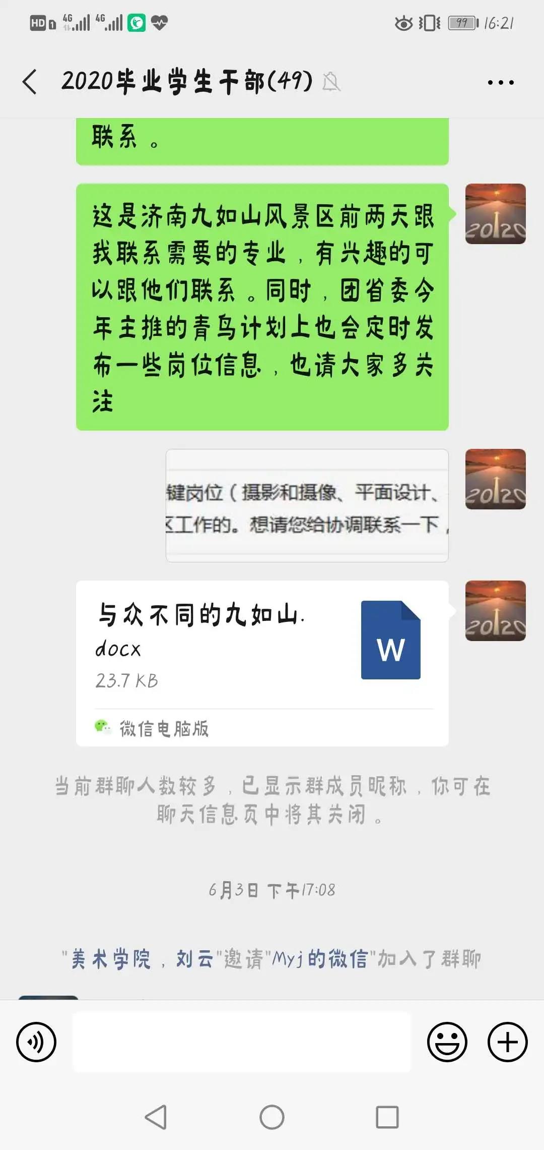 积极利用网络群组平台,搭建微信群、QQ群。由团委、校学生会牵头成立了2020年未就业学生干部信息交流微信群,及时发布、转发相关就业政策、就业招聘信息。期间联系对接九如山度假风景区,招聘摄像师、摄影师、平面设计师、文案等多个实习就业岗位。各学院也成立相应促进学生就业创业微信群,做好心理疏导、就业指导等相关工作,对武汉籍学生一对一精确指导、跟踪推进。在青马工程暨大学生骨干培训课程中加入职业规划课程内容,帮助在校学生树立职业规划意识,合理规划就业创业。