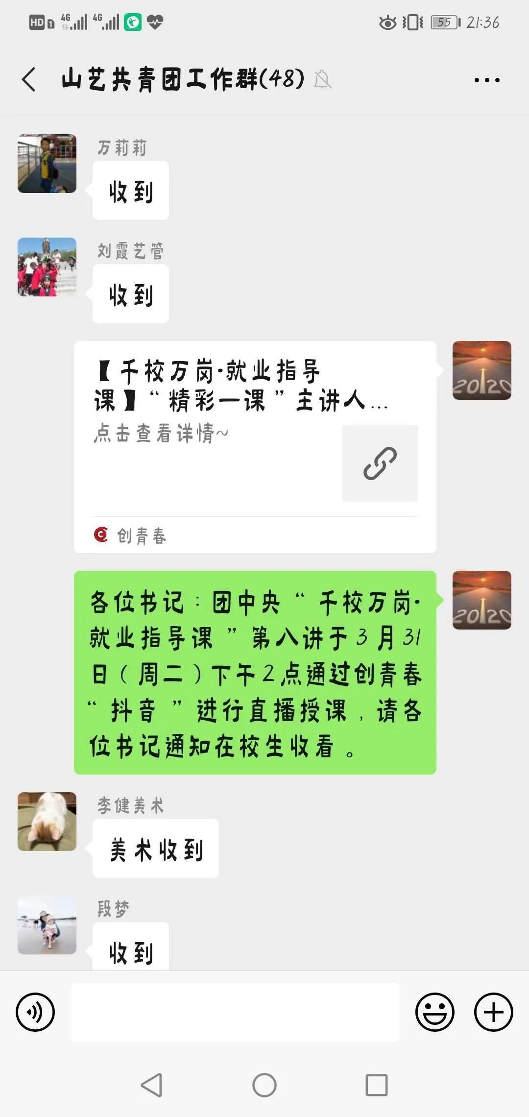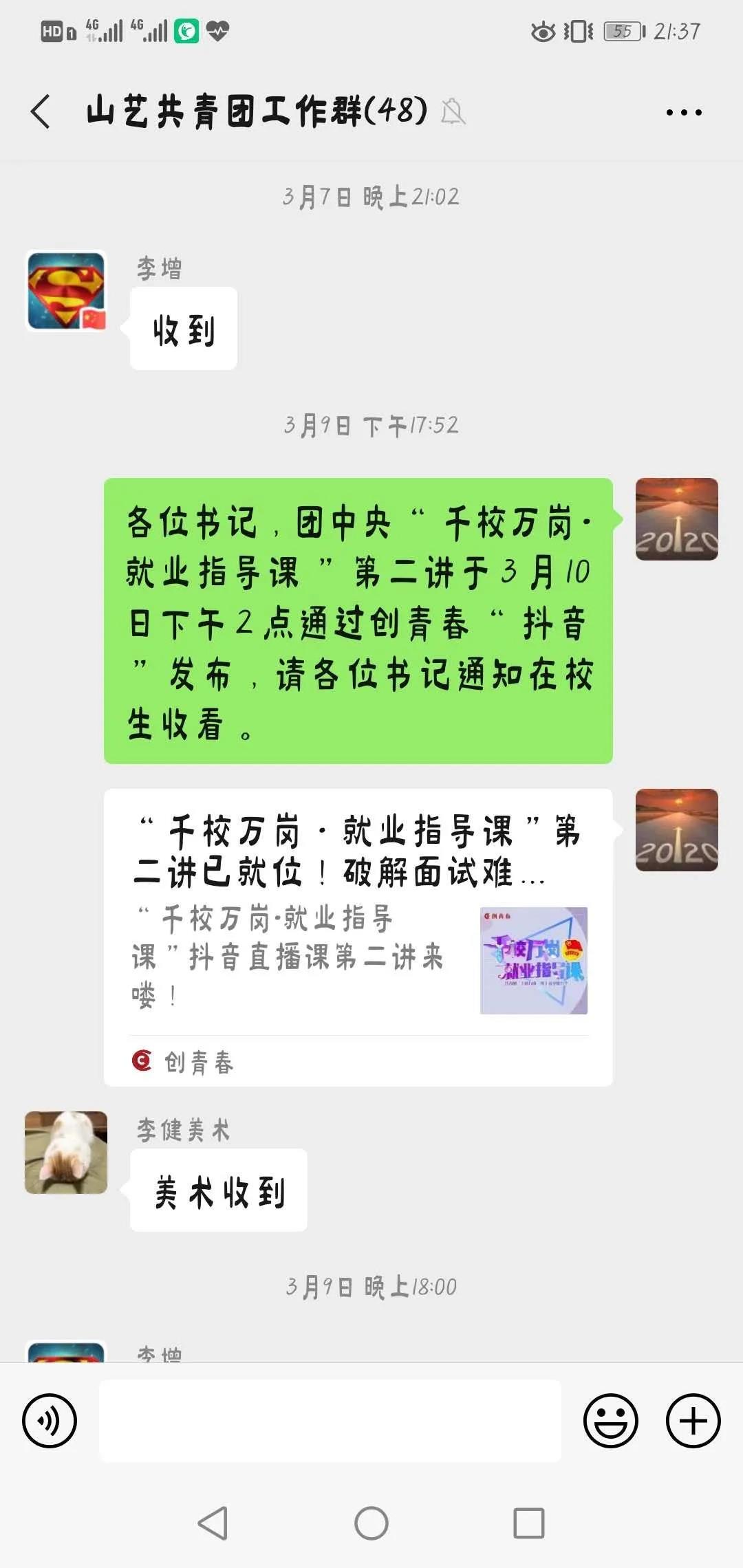 校团委与地方团委积极联系,实现校地协同、共促就业。与枣庄市团市委积极联系对接,为我校学生专门建立适合艺术类就业的岗位数据库,启动校内三级联动,精准一对一指导到有需求的毕业生。