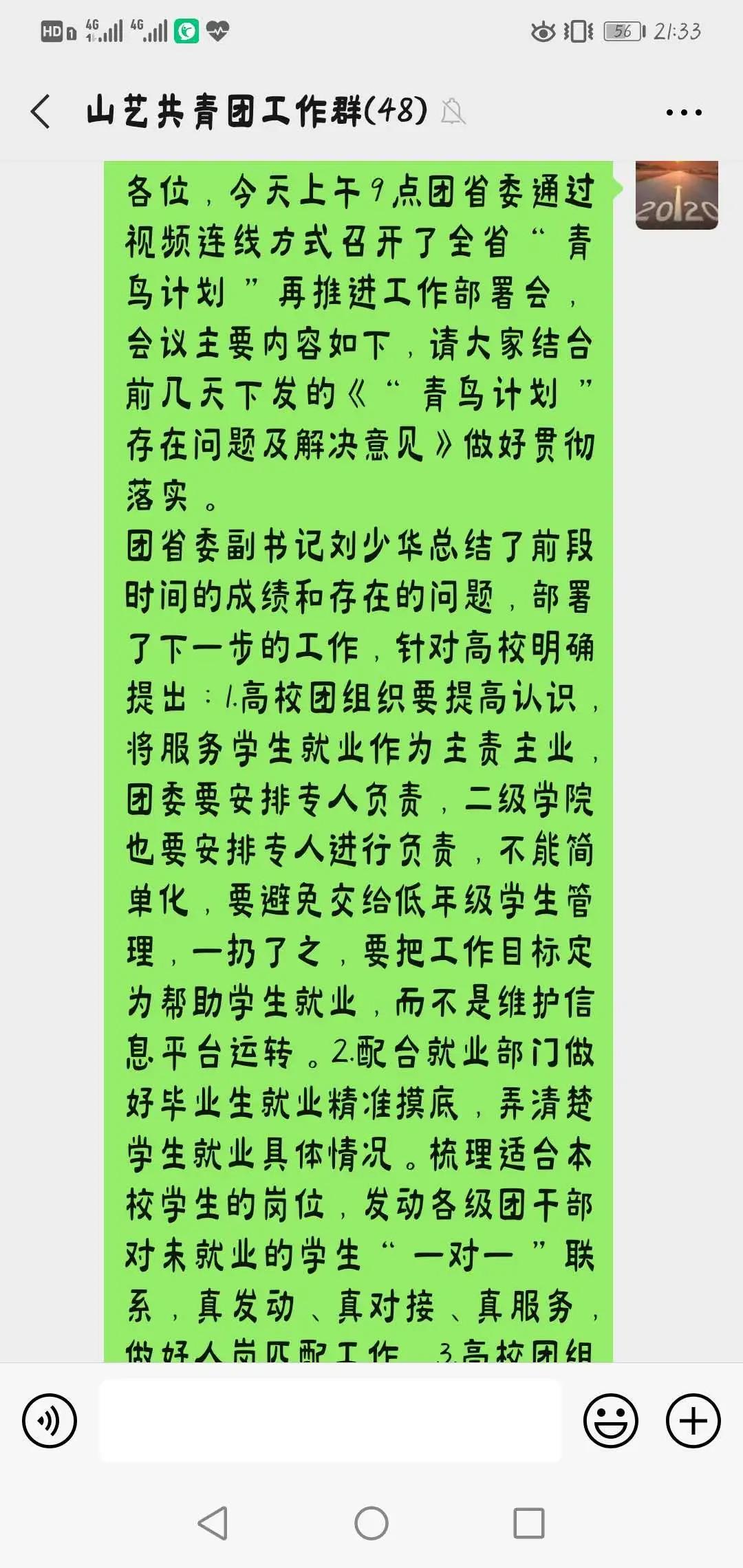 山东艺术学院团委认真落实团省委有关要求部署,围绕“稳就业”大局,依托“青鸟计划”平台,构建三级网络、用好三个平台、强化三方联动,精准助力青年学子就业创业,取得了良好效果。