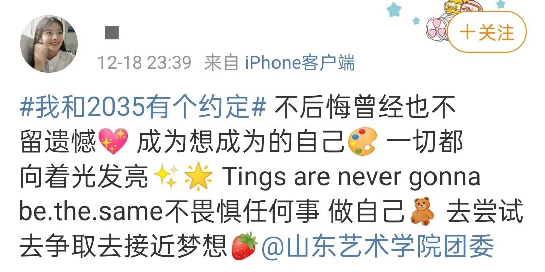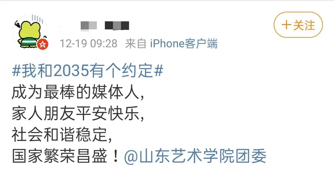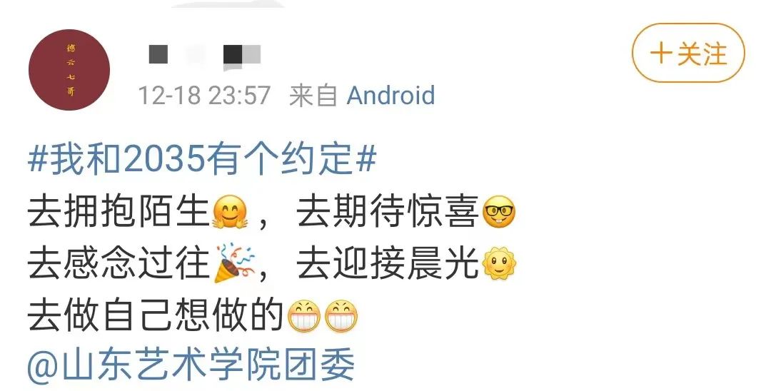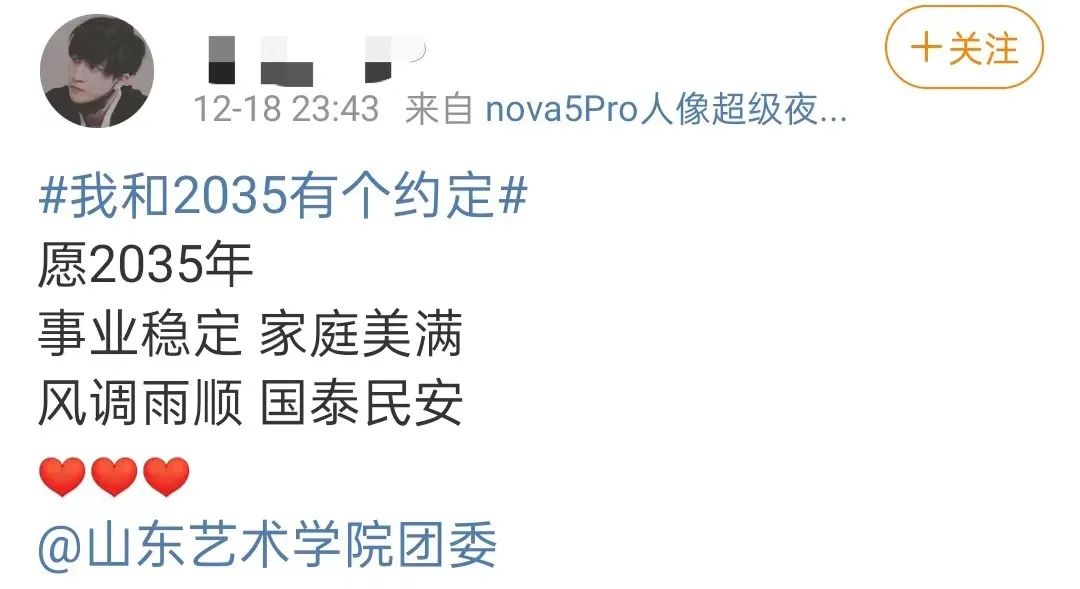 心仪的工作,美满幸福的家庭,还是来一场说走就走的旅行?下面团团带大家来看一看,其他山艺er的愿望!我和2035有个约定,不仅仅是一个梦想,更是我们心中的希望,是指引我们的曙光。我和2035有个约定,希望那时我们可以乘风破浪,在各自的领域主演自己的未来!我和2035有个约定,希望那时我们亲爱的祖国更加美丽和谐,昂扬屹立于世界!