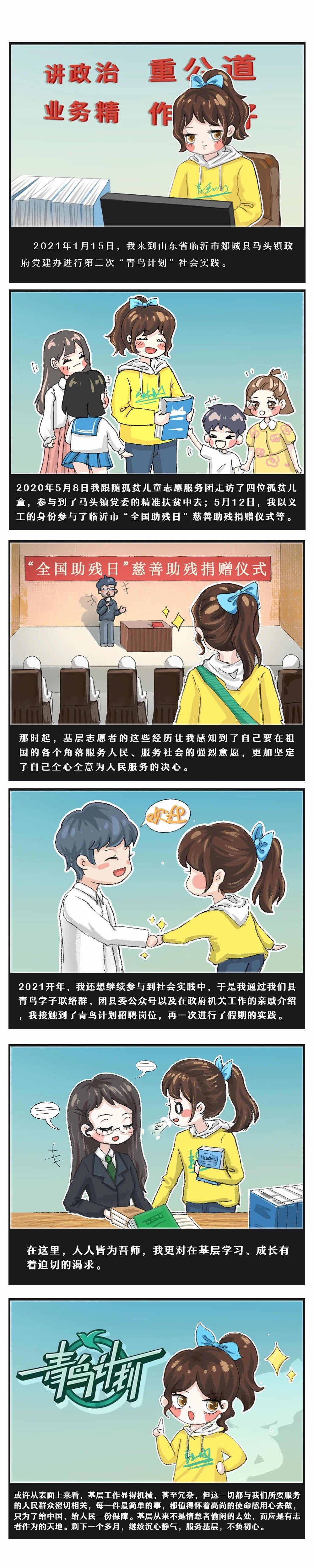 来自山东艺术学院的王淑萱同学,平日里时刻关注着山东省委"青鸟计划"的相关政策和平台,并先后在山东省临沂市郯城县马头镇政府党建办、郯城县工业和信息化局等部门进行“青鸟计划”社会实践。