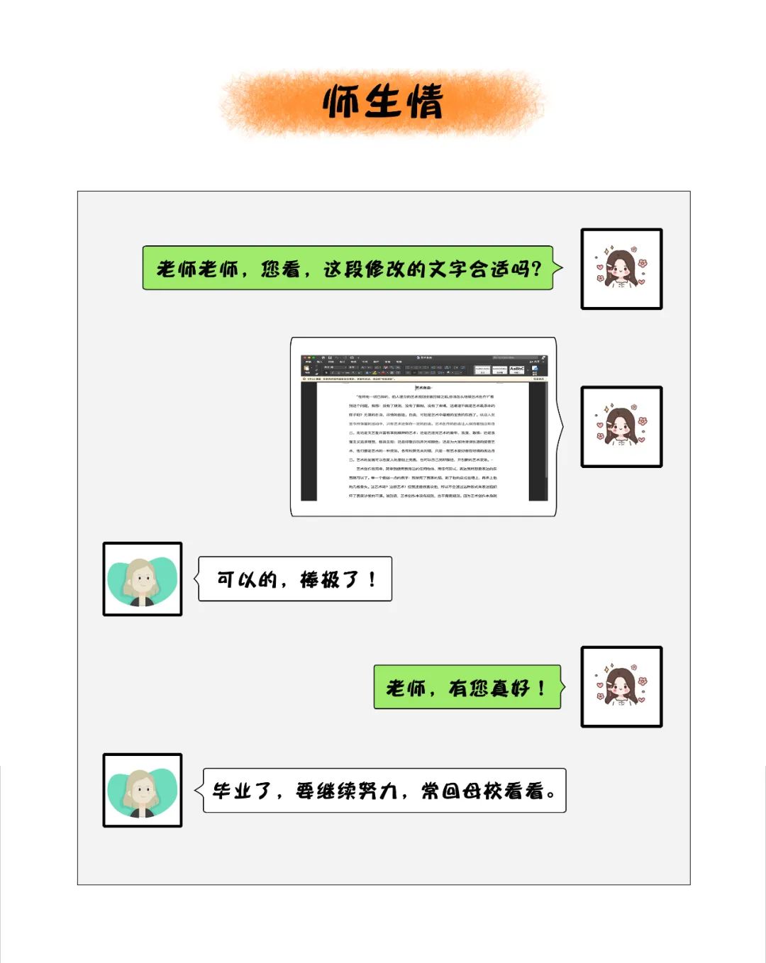 有这样一群人,与你朝阳相伴,星辰同行,迷茫时,为你疏导情绪;成功时,默默退到身后;犯错时,为你指引方向。悠悠学子心,浓浓师生情。虽已毕业,但永远是老师的学生。