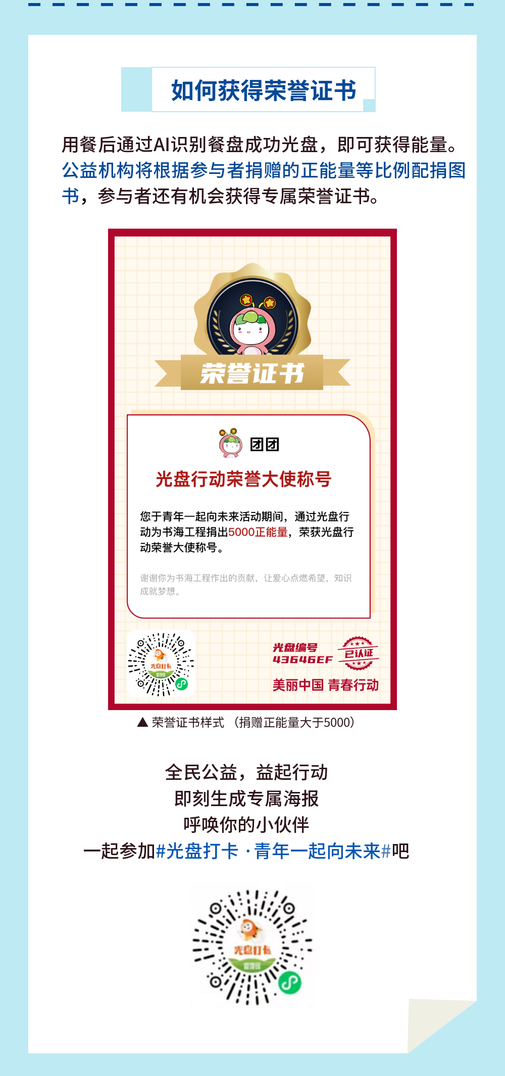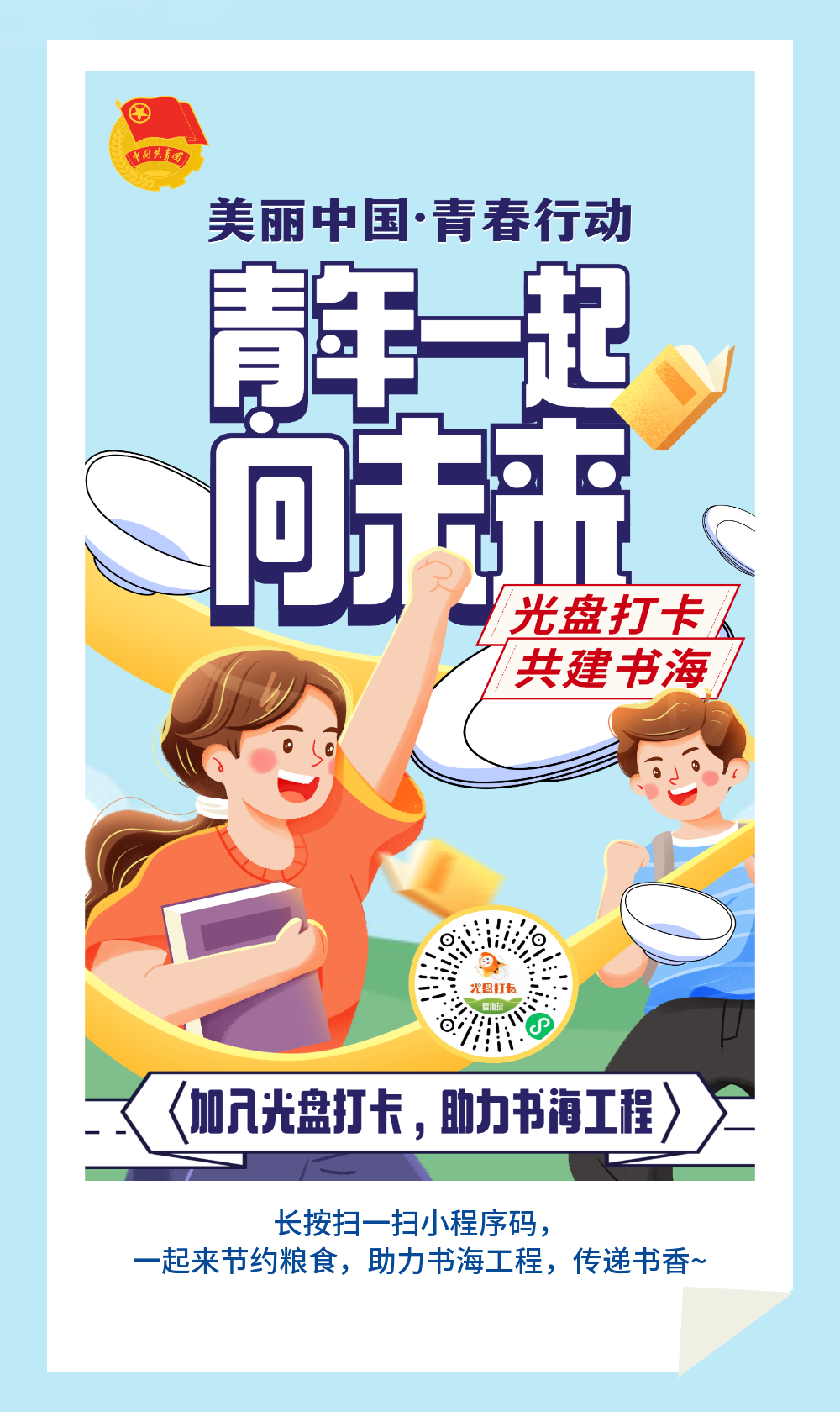 为进一步引导广大青少年学习宣传贯彻习近平生态文明思想,贯彻落实习近平总书记关于制止餐饮浪费的重要指示批示精神,自觉养成勤俭节约、珍惜粮食的绿色低碳生活习惯,共青团中央社会联络部联合中国光华科技基金会光盘行动公益基金,在2022年春节期间组织开展“光盘打卡·青年一起向未来”活动。
