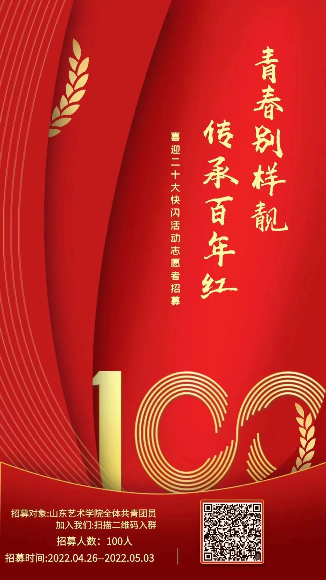 面向山东艺术学院全体共青团员,招募100名活动志愿者。