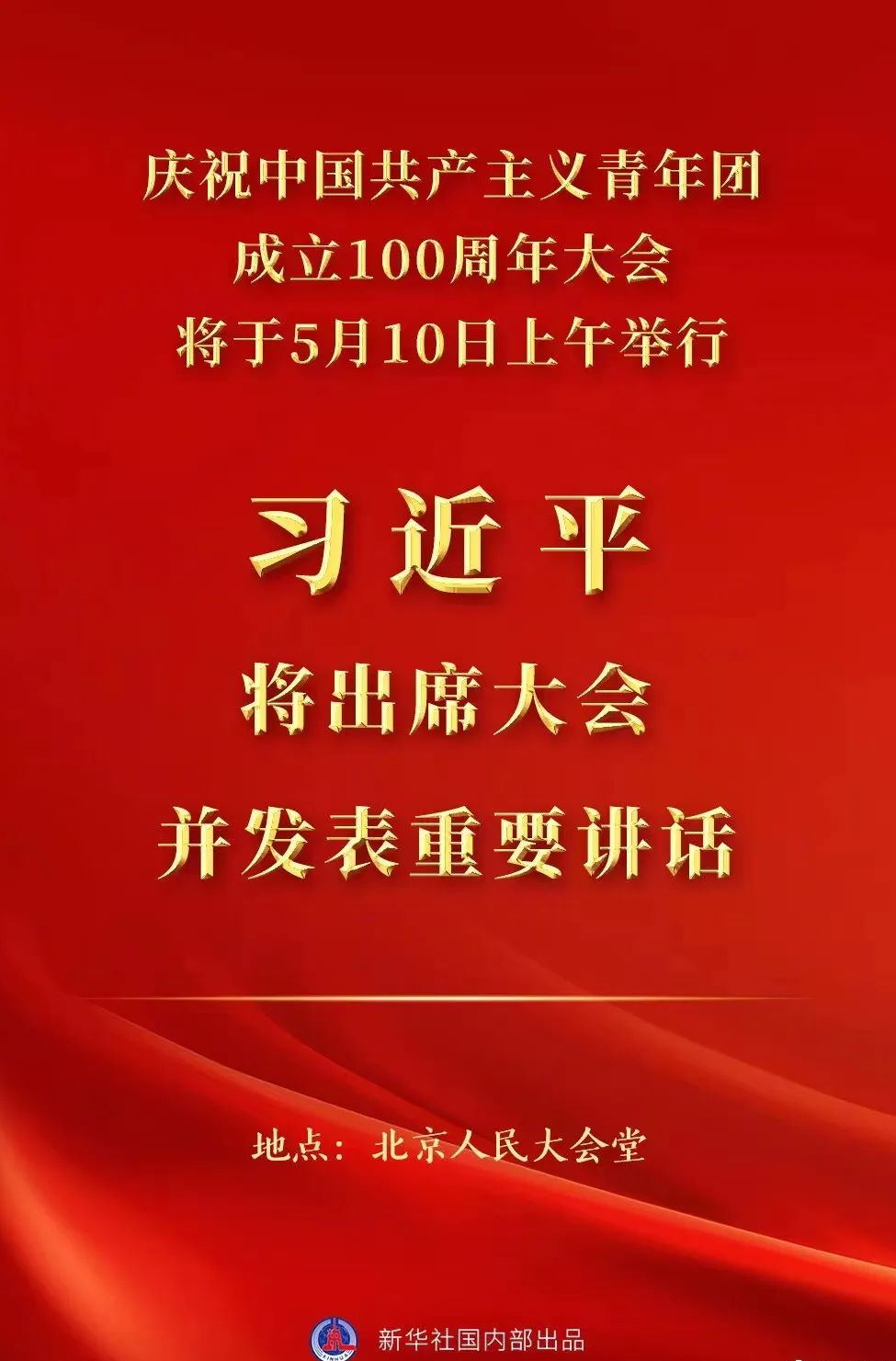 庆祝中国共产主义青年团成立100周年大会将于5月10日上午在北京人民大会堂隆重举行。中共中央总书记、国家主席、中央军委主席习近平将出席大会并发表重要讲话。