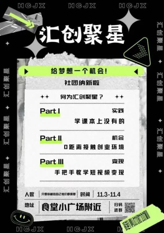 汇创聚星以创新、务实、团结、奋进为宗旨,致力于对接校外大型自媒体企业或其他相关企业与我校同学之间的联系,为学生提供就业创业教育服务。