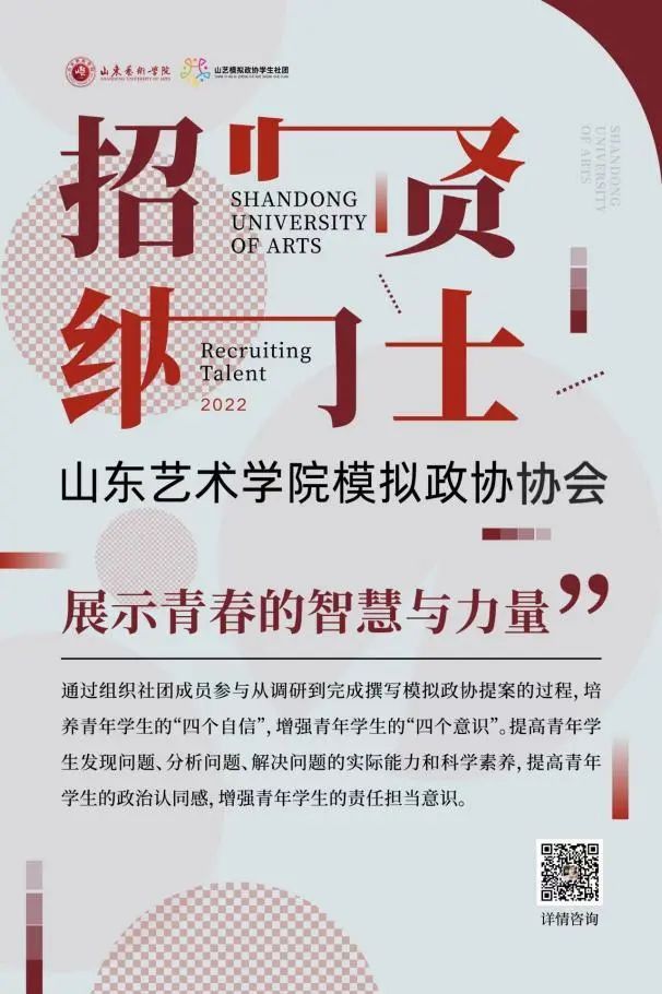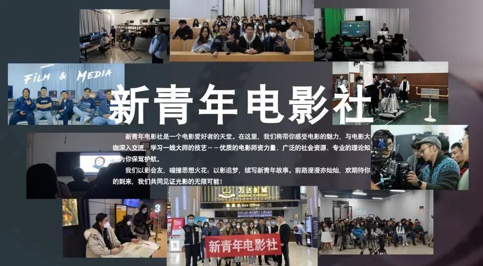 山东艺术学院新青年电影社是由电影学院研究生团体创办的电影爱好者社团,旨在弘扬红色主旋律,通过电影加强思政教育,传递红色正能量,汇聚电影爱好者团体,提高成员的电影素养,整合优势影创资源。