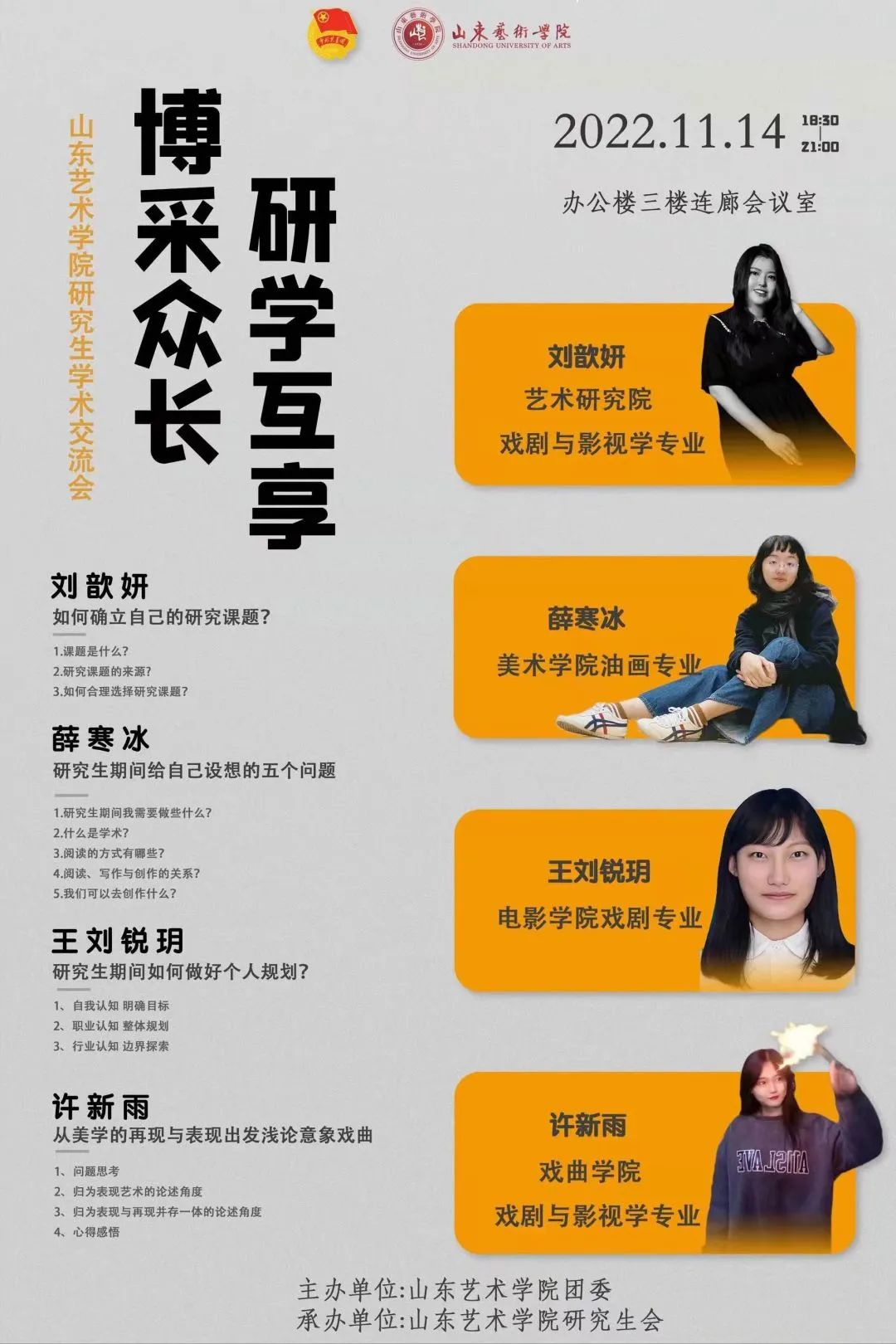 又是一年迎新季,对于新生来说,人生月台中的崭新的一站已经到达,面对新生活你是否有所期待?面对未来规划你是否迷茫?面对专业压力你是否无所适从?2022年11月14日晚18:30于办公楼三楼连廊会议室,我们将推出“博采众长·研学互享”——山东艺术学院研究生学术交流研讨会,从他们的科研之路和校园故事中获得思考和感悟,以榜样为明灯,以梦为马,不负韶华。