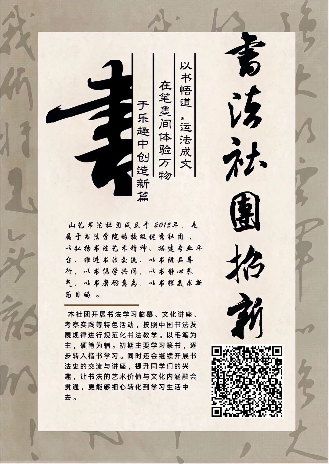执笔,墨上清欢,研墨,笔下惊鸿。山外淡云无墨画,竹间疏雨有声诗。书写横竖撇捺中国字,描绘文化之精深。书法社招新,欢迎驻足。