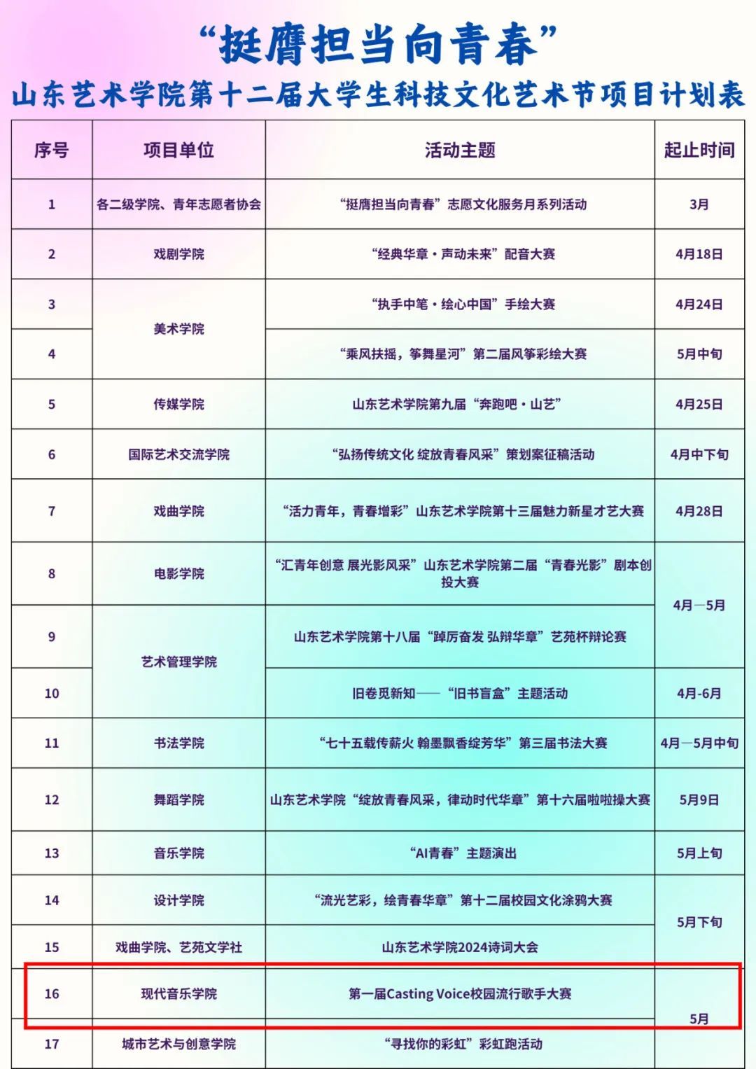 据悉,本次大赛由共青团山东艺术学院委员会主办,现代音乐学院承办,溶洞音乐独家冠名赞助,是我校第十二届大学生科技文化艺术节的一项重要活动,旨在丰富校园文化生活,凝练打造亮点品牌,强化文化赋能工程,推进学校共青团工作再上新台阶。