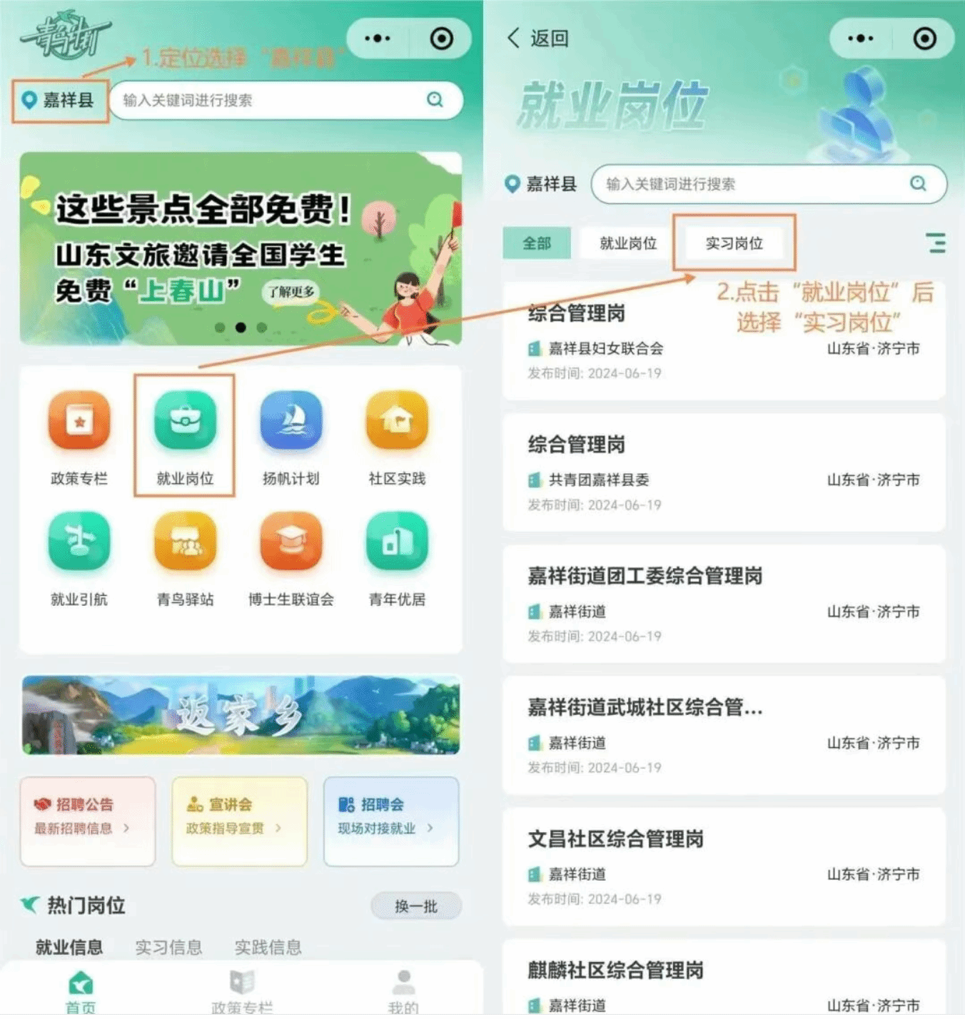 5.首页定位选择“枣庄市”,点击“就业岗位-实习岗位”,根据自己的意向查看岗位信息