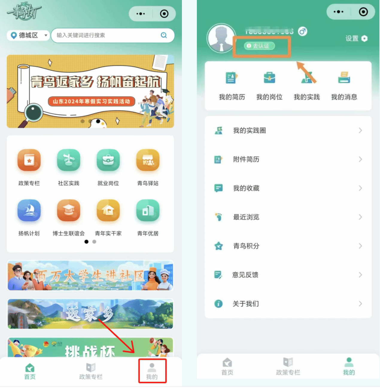 2.点击右下角“我的”,选择登录完善个人简历,填写认证信息,省内高校需要学校(学院)团委审核通过,省外高校等待省级系统统一审核通过,通过后才可以投递简历。