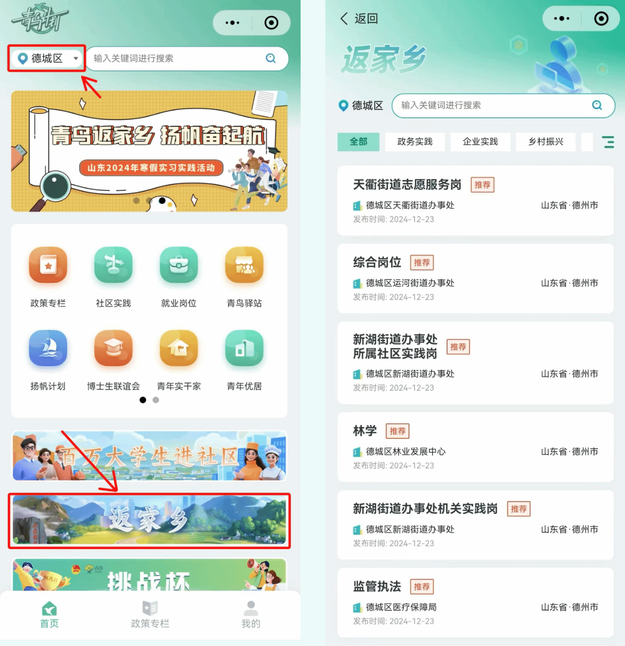 3.地点选择“德州市”,点击“返家乡”板块,选择自己适合的岗位投递简历即可