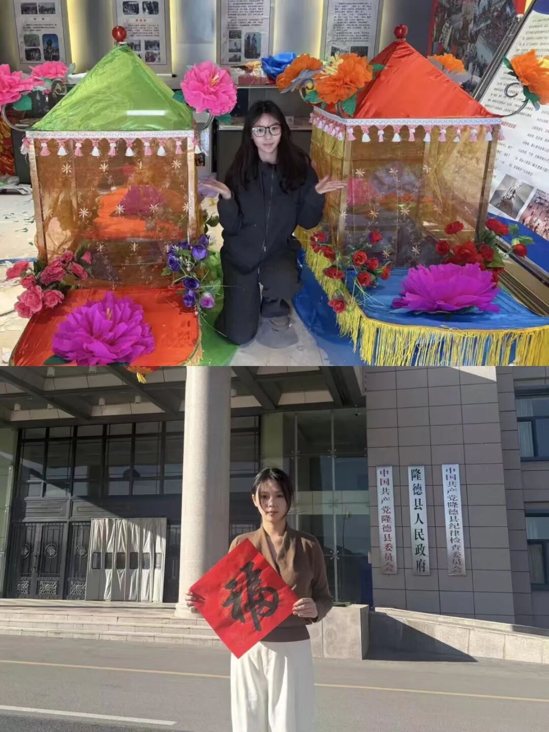 寒假期间,我回到家乡宁夏隆德,参与非遗传承与文旅宣传实践。我深入学习并参与国家级非遗隆德社火道具的制作与维护,同时结合舞美专业知识对道具结构和外观进行优化;我还担任文旅讲解员,向游客讲述六盘山红色历史与家乡乡土故事,以青春力量助力家乡文化传播。