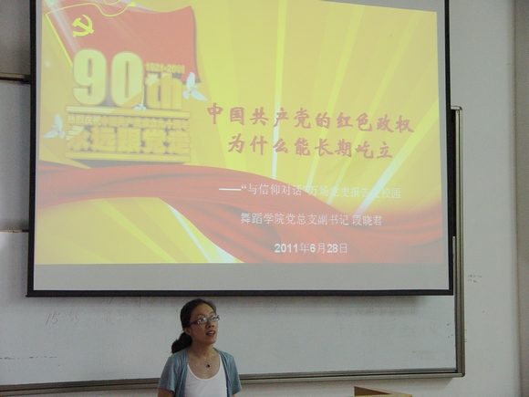 为纪念伟大的中国共产党成立90周年,引导广大青年学生进一步坚定“坚持共产党的领导,坚持走社会主义道路”的理想信念,落实团省委关于“学党史、知党情、跟党走”主题教育活动的安排部署,积极响应校团委在全校组织开展“与信仰对话——万场党史报告进校园”的活动,舞蹈学院团总支在党总支的指导下,成功举办了主题为“中国共产党的红色政权为什么能长期屹立” 的党史报告会。