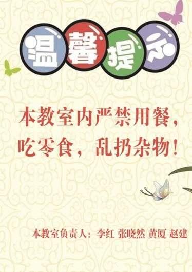 本站讯为达到美化教室,优化学习环境的目的,音乐学院学生会举办了“美化教室环境”活动,在教室张贴“本教室内严禁用餐,吃零食,乱扔杂物”的温馨提示海报,由勤工助学岗的学生专门监督、负责。