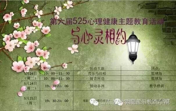 为提高大学生心理素质,塑造健全人格,号召大家“珍惜生命,关爱自己。”我院成功举办第六届“与心灵相约”大学生5.25心理健康节。本届5.25心理健康节的主题是“心随花开,花随你开”,主要活动包括“随音所动”,“音乐马拉松”“,“鼓动非洲”,“音乐观影”等。