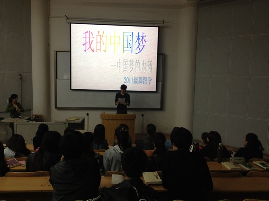 2010级舞蹈编导团支部、2011级编导班团支部围绕着“中国梦与青年学生关系”这一主题进行了团日讨论。2010级舞蹈编导团支部团支书带领全班同学了解了中国梦的来源,对习近平主席讲话的内容进行了学习,同学们踊跃发言,表示:“中国梦”落实到每一个青年,要把自己个人的梦想和中国梦相结合。作为学生,要做好自己身边的每一件事,安心做学问。每个人虽有差异,但是有共同的“中国梦”。中国梦和每一位青少年的工作、生活和学习息息相关,实现中国梦要依靠青年,同样,中国梦为青年造福。”2011级编导班团支部认真学习了习近平总书记向广大青年提出了五点希望,每位同学都积极发表了自己的看法,他们对自己的未来都有着独特的规划和人生理想。