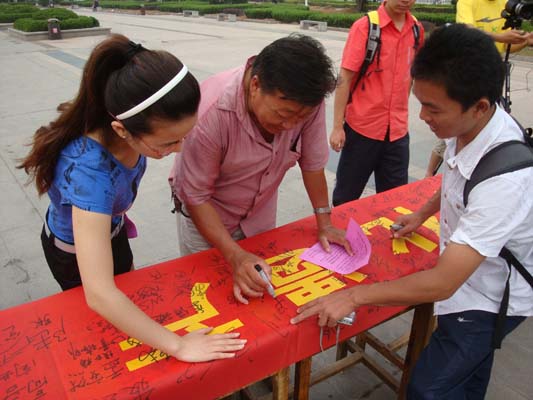 7月14日早晨,艺术文化学院暑期社会实践团的师生们又来到邹城市文化广场,举行了一场以“保护文化遗产,传承文明之光”为主题的大型签名活动,师生们通过发放宣传单页和现场宣讲等方式,普及文化遗产保护知识,提升市民保护文化遗产的意识,以吸引更多的市民走近文化遗产,了解保护文化遗产的重要性。这对推动文物保护工作的深入开展,形成全社会关注、参与文化遗产保护的热潮具有重要的意义。签名活动受到邹城市广大市民的广泛关注和积极参与,这也说明了邹城市民在保护文化遗产方面已具备了较高的素养。
