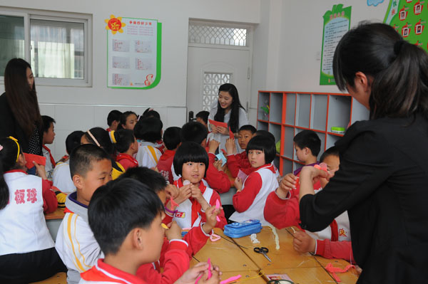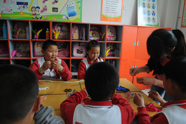志愿者老师们给这里的孩子上了一堂生动活泼的手工制作课,并赠送了制作工具。课堂上,志愿者耐心细致的给孩子们讲解示范如何制作表达祈福雅安心愿的心型、孔雀型卡片以及丝质太阳花,并在上面写上了“雅安加油”等话语,用实际行动教育孩子们用爱心传递温情,用爱心温暖世界。手工课受到孩子们的喜爱和欢迎,看着孩子们一张张可爱单纯的笑脸和他们亲手制作的战利品,志愿者们深深感受到助人为乐的价值所在,表示一定要传承雷锋精神,用实际行动践行雷锋精神,用所学知识服务社会。