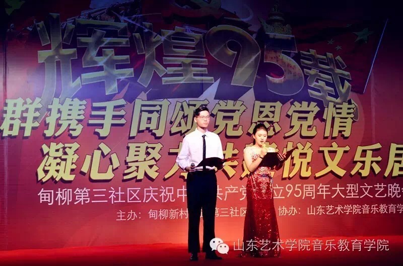 我院心声志愿者服务队自成立以来对甸柳第三社区长期志愿服务已有半年之余,举办了社区携手社会组织开办免费“悦之韵声乐班”、社区携手社会组织打造“心乐音疗”、舞蹈社团、喜剧社团、书法社团、绘画社团等活动,时值中国共产党建党95周年之际,7月1日晚,山东艺术学院音乐教育学院心声志愿者服务队与甸柳第三社区相互合作共同举办了隆重的“庆七一大型文艺晚会”。整个晚会的精彩表演充分展现出我们一年来坚持服务社区,发挥音乐的社会功能,繁荣社会文化的优异成绩。庆七一文艺汇演的成功举办特别得到了来自我院师生及社区领导的高度评价。
