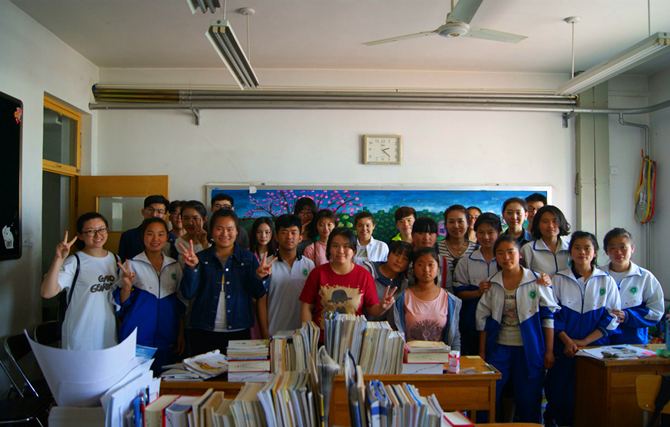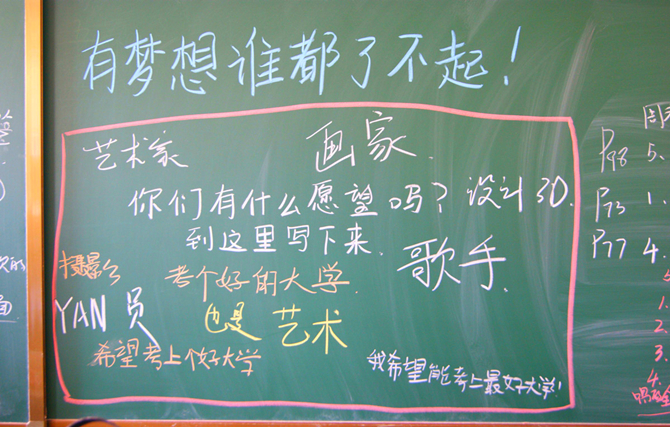 在高中部的教室,与听觉障碍的高年级孩子用手机打字交流,志愿者们在黑板上写出“你的愿望是什么?写到这里来吧。”的字样,高中部的同学纷纷写下了自己的愿望,更让人鼻子一酸的是,一位轻度听力障碍的女孩悄悄说:“我的愿望永远不会实现的。”接着,她在黑板上写出了“yan员”,暗指她的愿望是做一个演员。志愿者十分动容,最后在黑板上留下一句“有梦想谁都了不起”。在视障儿童的合唱课堂,志愿者们聆听了动人的励志歌曲《蜗牛》。虽然有视觉障碍,但他们的音准很好,音色动听。