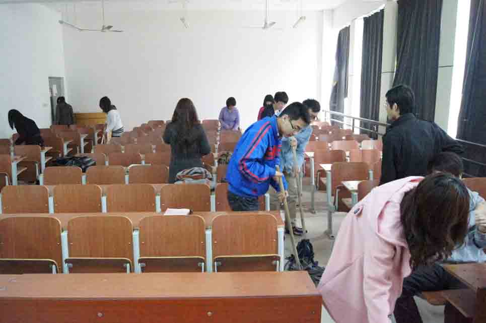 活动开始,社会实践部部长朱丽萍向参加本次活动的同学阐述本次学习雷锋活动的目的及意义,希望通过本次活动达到督促同学养成良好生活、学习以及卫生习惯的目的。在干事张宁向广大志愿者宣读完“争做教室环保卫士倡议书”之后,环保卫士们热火朝天地的打扫起3个公共教室的卫生,他们以自己的实际行动和汗水践行了学习雷锋精神的誓言。