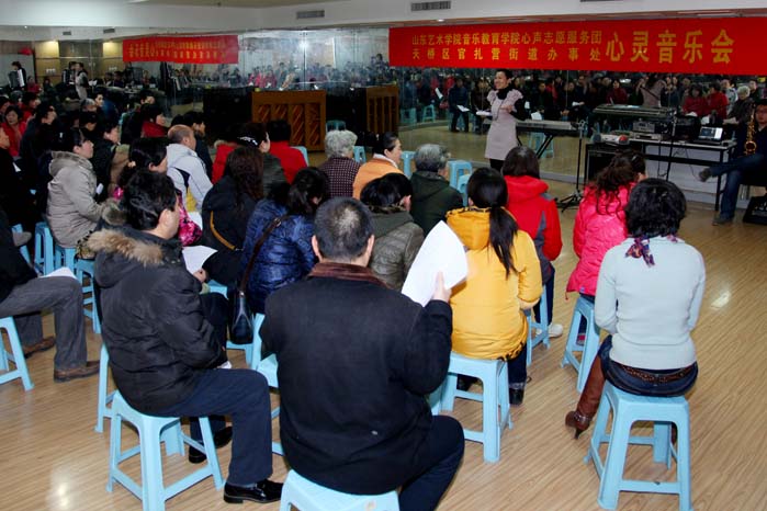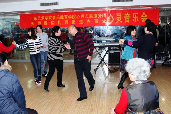 这次学雷锋活动音乐教育学院依托音乐教育和音乐治疗专业资源,充分发挥学院办学特色,为社区送上了一场涵盖音乐表演、音乐互动、音乐想象在内的“心灵音乐会”。上午9点,在天桥区文化局四层排练厅,来自官扎营街道的近60位居民欢聚一堂。音乐会第一部分,“心声”志愿服务团的同学们在进行手风琴合奏、萨克斯、电子琴弹唱、男生小合唱等表演的同时,以通俗易懂又不失专业水准的方式对曲目、乐器和音乐背景进行介绍,将音乐对身心健康的原理和作用融入到音乐欣赏中,受到了居民们的喜爱和欢迎;第二部分,师生一起带领观众进行音乐互动,先是在华尔兹音乐中翩翩起舞,然后通过个体即兴的方式进入对人性格、情绪的探索,引起了观众浓厚的兴趣;第三部分,我院音乐治疗专业教师带领全体演员和观众进行了一次音乐想象之旅:先逐步引导全身放松,之后在特别挑选的几段音乐的引导下进入想象空间,在经过十多分钟左右的音乐想象过程之后,慢慢被唤醒,醒来之后,大家使用彩笔在白纸上描绘出想象的内容,很多人表示通过这样的方式找到了放松的感觉、在分析的过程中对自己有了更多的了解、学习到新的与自我相处的方法、开始有意识地关注内在等等。最后,一首《同一首歌》的全体合唱将音乐会主题升华,伴着优美的萨克斯独奏结束了本次活动。