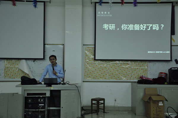 本报讯4月11日19时,由设计学院团总支与高联教育联合举办的考研讲座在设计学院A楼C301教室举行。高联教育中心孙主任应邀和各位考生一起讨论考研方向选择、各类课程的具体安排及国内各所院校的具体情况。