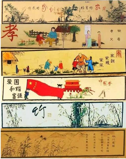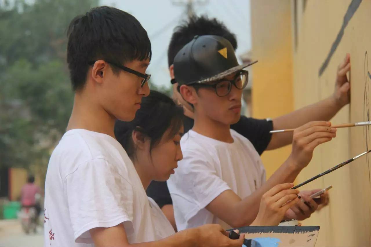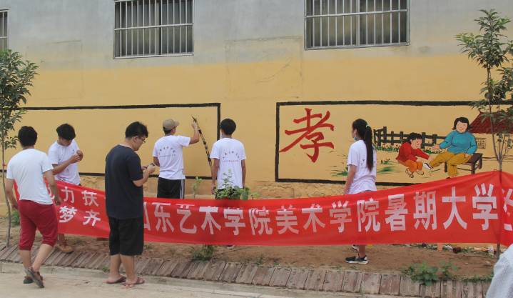 菏泽市郓城县黄集乡东关村是山东艺术学院“第一书记”帮包村,地理位置偏僻、经济发展落后,村中有大量的留守儿童和孤寡老人,日常文化生活匮乏。为切实丰富村民文化生活,体现人文关怀,山东艺术学院美术学院大学生暑期实践团的成员们发挥专业优势,扶贫小分队的师生严格筛选设计稿,拟定了独具特色的墙绘绘制方案,贴近村民实际生活、注重“家训,家风 ”传统文化精髓的主体内容。墙绘采用丙烯为墙绘原料,挥毫泼墨,通过绘制,一幅幅装饰艺术画扮靓了原本斑驳的墙面。绘制过程中,队员们为避免颜料损坏花草树木,还特意在草坪上铺垫了报纸。文化墙绘绘成后,备受校村民的青睐,大家纷纷驻足品评,赞不绝口。