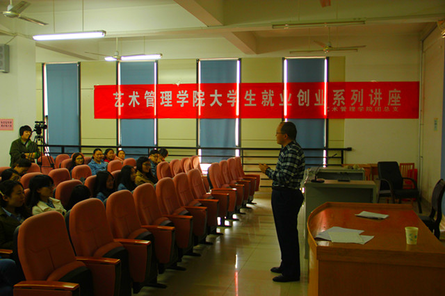 讲座中,他首先为同学们介绍了艺术管理专业对文化建设的重要意义,为艺管学子指明了未来的发展方向。而后,用幽默诙谐的语言、鲜活生动的个人经历,从“大学生该学什么”、“怎样提高心理承受能力”、“如何应对创业困难”等方面全面阐释了大学生创业就业所必须具备的素质和能力。他指出大学生应该客观认识自我,明确选择方向,尽早做一份职业生涯规划,以便更好地规划未来。他鼓励大家,要树立积极的就业态度,培养健康的就业心理,提高应对挫折的能力。同时也提醒大家,在日常学习中应适当拓宽知识的广度和深度,争取成为“通才”型毕业生,向满足市场需求的方向努力!